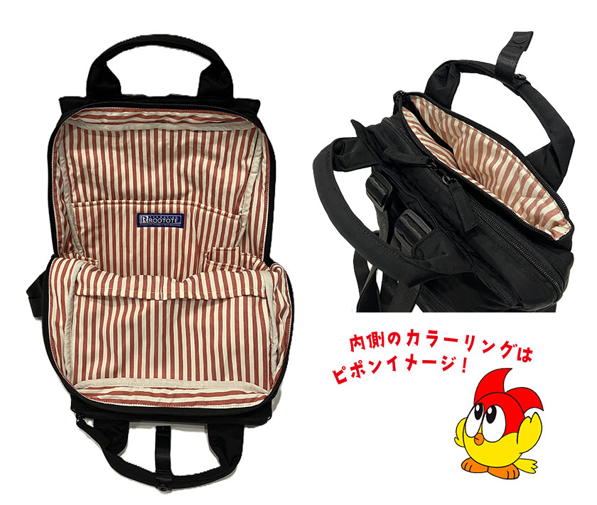 内側のストライプはビースタジオのオリジナルキャラクターの「ピポン」をイメージした赤のストライプ。どのポケットを開けても明るく、見やすいカラーとなっています。