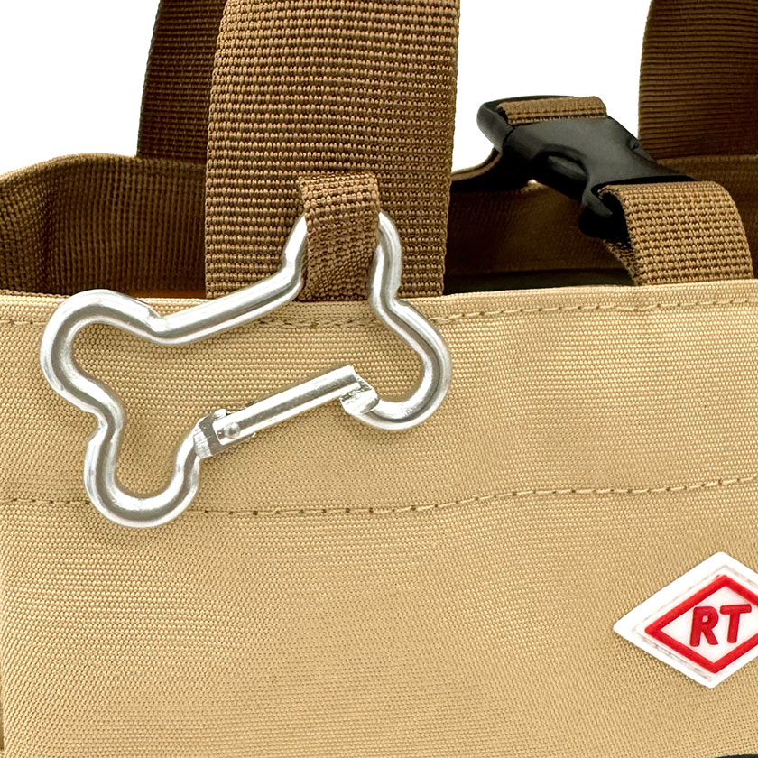 ボーン型のカラビナには、マナー袋や水飲み用のお皿がかけられます