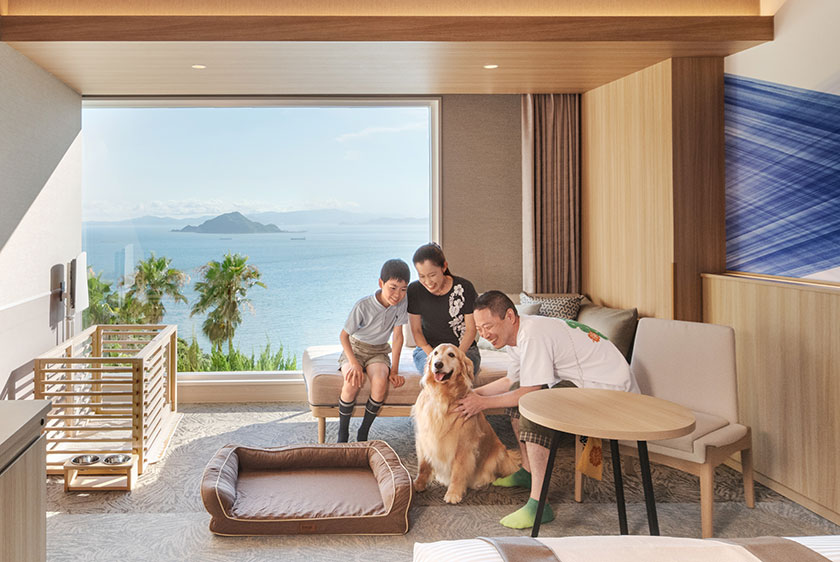6室ある “ドッグフレンドリールーム”では、専用アメニティや専用ドッグカートで快適な愛犬とのステイをサポート。さらに、全室オーシャンビューなので、大きな窓から伊良湖岬や神島を一望!特に日没前後に現れる美しいマジックアワーの絶景を、愛犬とともにお楽しみいただけます。