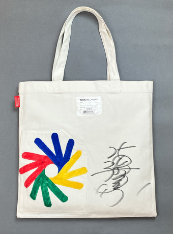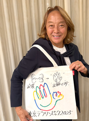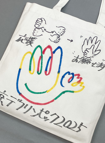 今回その「東京2025デフリンピック」のサッカー競技のスペシャルサポーターに就任致しました。トートバッグには、そのデフリンピックのロゴと、「応援お願いします」という意味の手話を描きました。
